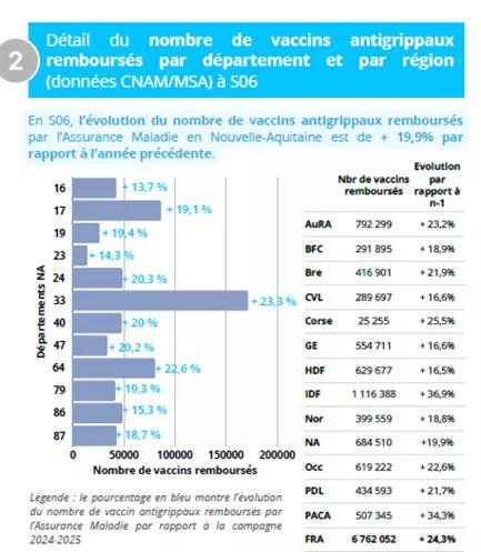 En Nouvelle Aquitaine, la campagne 2025-2026 de vaccination a bien démarré par rapport à l’année dernière, que ce soit la vaccination des personnes à risque (hausse de 21 % du nombre de vaccins remboursés) ou du reste de la population qui sont allés massivement en officine acheter leur vaccin (hausse de 17,9 % pour la vente de vaccins dans les officines).