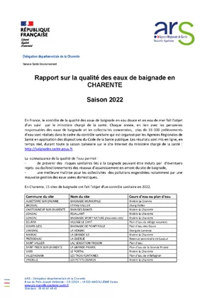 Vous pouvez consulter tous les rapports sur la qualité des eaux de loisirs disponibles à ce jour établis par les délégations départementales de l’ARS au terme de la saison 2022 présentant l'organisation de la surveillance, la qualité des eaux de mer et des eaux douces.